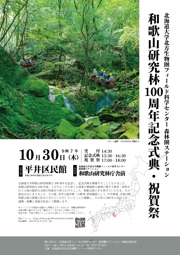 北海道大学和歌山研究林創立100周年を記念し、記念式典を開催することとなりました。